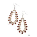 A glitzy collection of classic topaz and golden topaz rhinestones flank a studded silver teardrop frame, resulting in a glamorous lure. Earring attaches to a standard fishhook fitting.