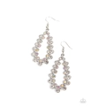 A glitzy collection of white and iridescent rhinestones flank a studded silver teardrop frame, resulting in a glamorous lure. Earring attaches to a standard fishhook fitting.
