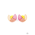 Featuring airy stenciled linear patterns, overlapping pink and orange crescent shaped frames gather around a dainty yellow crescent frame, creating a modern display. Earring attaches to a standard post fitting.