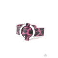 Featuring a shiny pink cheetah pattern, a textured piece of leather loops through the center of a shimmery silver hoop for a sassy urban look. Features an adjustable belt loop closure.