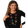 Infused along a double-layered, elongated silver chain, chunky brightly-colored shell discs with light-reflecting finishes join layers of metallic silver rings beside solitaire pink, blue, and yellow shells in varying sizes to create a retro-inspired display. Features an adjustable clasp closure.