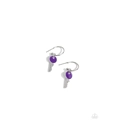 A small, skinny, shiny silver hoop curves around the ear in a timeless fashion. A shiny silver ball is affixed to the end of the hoop, reminiscent of a barbell fitting. A silver key charm, featuring a bright purple-painted accent, slides along the curvature of the hoop, adding a surprising hint of colorful movement. Earring attaches to a standard post fitting. Hoop measures approximately 1/2" in diameter.