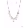 A glamorous collection of bubbly white pearls and exaggerated white teardrop gems dangle from a bold strand of white rhinestones, creating a knockout fringe below the collar. Features an adjustable clasp closure.