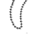 Featuring a gunmetal paperclip link chain, a series of sleek gunmetal knots coalesces around the collar for an industrially edgy statement. Features an adjustable clasp closure.