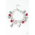 Red pearls, ornate silver beads, and white rhinestone encrusted accents swing from a dramatic silver chain. A shimmery silver bird charm and silver tassel are added to the display, creating a whimsical fringe around the wrist. Features an adjustable clasp closure.