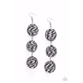 A woven collection of black and white crepe-like strings ornately wraps around three hanging beads, reminiscent of decorative party lanterns. Earring attaches to a standard fishhook fitting.