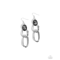 Dotted with a silver-pronged smoky oval gem, mismatched thick and elongated silver ovals interlock into a stationary lure, resulting in a rippling frame. Earring attaches to a standard fishhook fitting.