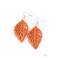 Brushed in a distressed Amberglow finish, an airy wooden frame has been cut into a leafy stenciled design for a woodsy look. Earring attaches to a standard fishhook fitting.