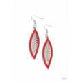 Bordered in a red leather trim, an airy silver leaf frame swings from the ear for a wildly seasonal fashion. Earring attaches to a standard fishhook fitting.