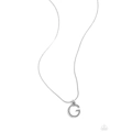 A row of glistening white rhinestones encrusts along one side of a silver letter "G" hovering below the collar from a dainty silver chain for a sentimentally simple design. Features an adjustable clasp closure.