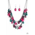 Two strands of silver chain are decorated in a flirtatious fringe of faceted green, pink, and plum teardrops. Glittery beveled silver teardrops are sprinkled between the colorful beading, adding hints of shimmer to the vibrant design. Features an adjustable clasp closure.