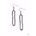 High sheen gunmetal cylinders, bent into J-shapes, are connected with gold rings resulting in a mixed-metal modern industrial fashion statement. Earring attaches to a standard fishhook fitting.