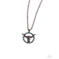 Gliding along a copper paperclip chain, a turquoise stone-bordered copper pendant with a copper longhorn skull centerpiece cascades below the neckline for a trendy, Texan-inspired look. Features an adjustable clasp closure. As the stone elements in this piece are natural, some color variation is normal.