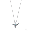 A silver rope chain features a bull skull pendant accented with black-painted horns and a turquoise stone centerpiece. The intricate details of the pendant bring a bold and rustic edge to the design. Features an adjustable clasp closure.