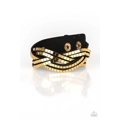 Flat gold cubes are encrusted along rows of braided black suede for an edgy look. Features an adjustable snap closure.