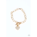 Radiating with glassy white rhinestones, a glittery gold heart charm swings from a glistening gold chain for a flirtatious look. Features a toggle closure.