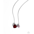 Infused along a silver snake chain, a duo of silver hearts, one dusted in light rose rhinestones and the other featuring a faceted red gem are tilted in towards each other below the neckline for a smitten sweet display. Features an adjustable clasp closure.