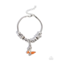 Infused along a silver snake chain, a collection of round silver beads, silver discs, and floral-textured silver beads loop around the wrist for a subtly whimsical statement. A tilted, abstract silver butterfly adorned with studded orange-painted wings and airy stacked rhinestone-detailing gracefully flutters along the center of the display for an adorably aerial finish. Features an adjustable clasp closure.