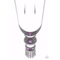 Embossed in studded, geometric, and paisley filigree-like patterns, three mismatched silver half moon plates dramatically link below the collar. Featuring an iridescent UV shimmer, an oversized collection of square, teardrop, and round rhinestones embellish the decorative silver frames, while a silver beaded fringe swings from the lowermost plate for a noisemaking finish. Features an adjustable clasp closure.