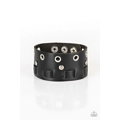 Infused with silver rings and silver studs, a band of leather cording is threaded down the side of a black leather band for a rugged look. Features an adjustable snap closure.