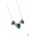 Gliding from a silver snake chain, a sparkly collection of upside-down emerald teardrop gems, wrapped in trilliant-like rhinestone and studded frames coalesce the neckline. Separating each sparkly gem, white rhinestone-encrusted silver rings create an additional spritz of glitz to the design. Features an adjustable clasp closure.