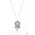 Infused with glassy Pale Rosette beaded accents, a whimsical assortment of silver key, heart, and floral charms cascades from an oversized studded silver frame that whirls with heart shaped vine-like filigree. The ornate frame swings from the bottom of a Pale Rosette beaded silver chain, adding a flirtatious pop of color to the sensational fringe. Features an adjustable clasp closure.