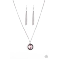 A glittery pink gem is pressed into a studded silver frame, creating a glamorous pendant below the collar. Features an adjustable clasp closure.