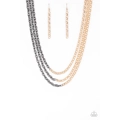 Strung between two gold fittings, glistening gunmetal chains collide with shimmery gold chains below the collar, creating edgy mixed metallic layers. Features an adjustable clasp closure.