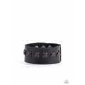 Brown laces are threaded through two pieces of black leather, creating crisscrossed stitches that hold the rustically studded centerpiece together. Features an adjustable snap closure.