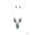 A trio of glittery blue marquise-cut rhinestones are nestled inside swirls of hammered silver frames, creating a dazzling statement piece below the collar. Features an adjustable clasp closure.
