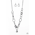 Delicately hammered in shimmery textures, asymmetrical gunmetal frames and hoops connect into an edgy chain across the chest. A lobster clasp hangs from the bottom of the design to allow a name badge or other item to be attached. Features an adjustable clasp closure.