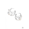 Two dainty silver bars curve into dazzling double hoops, creating an asymmetrical framework. Varying sizes of classic pearls dot the edges of the classic hoops, creating the illusion of floating pearl accents. Earring attaches to a standard post fitting. Hoop measures approximately 1 1/2" in diameter.