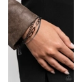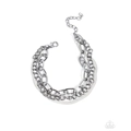 An intense display of mismatched gunmetal and silver chains, including a paperclip, classic, and herringbone chain, boldly layer around the wrist, creating an unmatched, industrial vibe. Features an adjustable clasp closure.