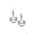 Featuring a glittery white rhinestone and faceted Green Sheen beading, an abstract crescent frame attaches to a hammered silver disc, creating a colorfully rustic lure. Earring attaches to a standard fishhook fitting.