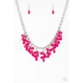 Featuring round and teardrop shapes, clusters of faceted pink beads swing from the bottom of a shimmery silver chain, creating a playful fringe below the collar. Features an adjustable clasp closure.