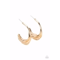 Featuring a high-sheen, a chunky gold hoop is melted and molded into a bold, modern design. Earring attaches to a standard post fitting. Hoop measures approximately 1" in diameter.