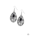 Ringed in glassy white rhinestones, a teardrop black bead is pressed into a shimmery silver frame radiating with airy filigree for a refined fashion. Earring attaches to a standard fishhook fitting.