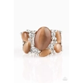 Glittery white rhinestones and glowing brown moonstones are sprinkled across the finger, coalescing into a whimsical band. Features a wide stretchy band for a flexible fit.