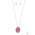 Vivacious pink oval stones embellish the front of a decoratively scalloped silver frame, creating an earthy floral pendant at the bottom of an extended silver popcorn chain. Features an adjustable clasp closure.