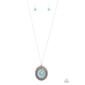 An oval turquoise stone is pressed into the floral embossed center of a studded and scalloped silver frame at the bottom of an extended silver chain, creating an authentic floral pendant. Features an adjustable clasp closure.