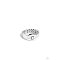 Pressed into the center of a beveled silver band, the black letter "c" stands out for a simple, sentimental centerpiece. Features a stretchy band for a flexible fit.