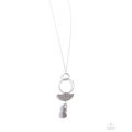 Silver hoops, a slice of textured semi-circle disc, and a hammered silver obelisk all dangle from a long chain for a trend-setting combination. Features an adjustable clasp closure.