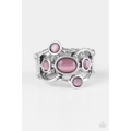 Featuring smooth and textured finishes, glistening silver bars swoop across the finger, coalescing into an airy band. Varying in shape, glowing purple moonstones dot the swaying bands for a refined finish. Features a stretchy band for flexible fit.