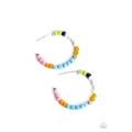 A colorful strand of green, royal blue, white, reflective yellow, gold, blue, orange, and pink seed beads follow the curve of a silver hoop, creating a colorfully charismatic look. Earring attaches to a standard post fitting. Hoop measures approximately 1 1/4" in diameter.