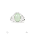 An opalescent Spearmint bead is pressed into the center of a dainty silver band radiating with studded silver textures for a whimsical look. Features a dainty stretchy band for a flexible fit.