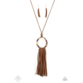 A collection of earthy multicolored stone beads are threaded around a wire hoop that is fastened at the end of a lengthened brown suede cord. The earthy stones make way for a foxy fringe of brown suede that sways from the bottom of the hoop, resulting in a rustic down-to-earth vibe. Features an adjustable clasp closure.