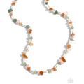 Infused along an invisible string, chiseled jade, orange, and pink stones alternate with gold seed beads and white baroque pearl beads for an elegantly earthy display around the collar. Features an adjustable clasp closure. As the stone elements in this piece are natural, some color variation is normal.