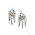 Gradually tapering below the ear, glassy white rhinestones embellish along silver bars while turquoise, orange, and green-beaded flared bars create a dramatic fringe at the bottom of a decorative silver-studded frame swirling with turquoise, orange, and green stones in round and marquise-cuts for an over-the-top earthy lure. Earring attaches to a standard fishhook fitting. As the stone elements in this piece are natural, some color variation is normal.