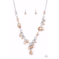 A modern collection of asymmetrical pearly brown beads adorn sections of a chunky silver chain below the collar. Matching pearly beads sporadically trickle from the chain, resulting in a timelessly tasseled display. Features an adjustable clasp closure.