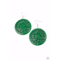 A bold mandala-inspired design is carved out of an oversized green disc creating an eye-catching statement. Earring attaches to a standard fishhook fitting.